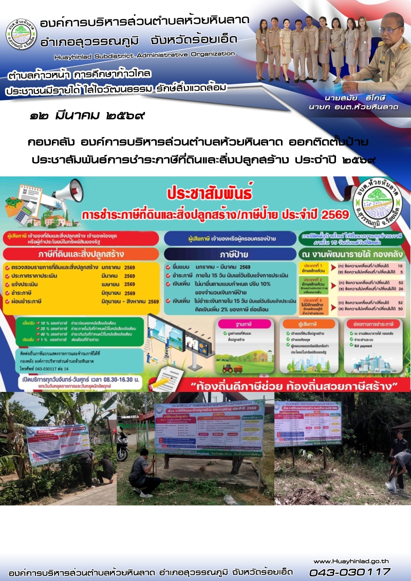 กองคลัง องค์การบริหารส่วนตำบลห้วยหินลาด ออกติดตั้งป้ายประชาสัมพันธ์การชำระภาษีที่ดินและสิ่งปลูกสร้าง/ภาษีป้าย ประจำปี ๒๕๖๙ บริเวณพื้นที่รอบตำบลห้วยหินลาด