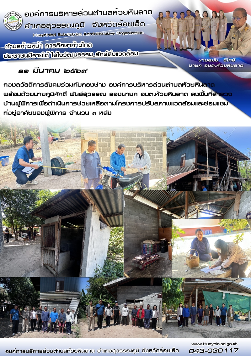นายภูมิศักดิ์ พันธ์สุวรรณ รองนายก อบต.ห้วยหินลาด พร้อมกองสวัสดิการสังคมและกองช่าง ลงพื้นที่สำรวจความต้องการซ่อมแซมบ้านผู้พิการ ประจำปีงบประมาณ ๒๕๖๙