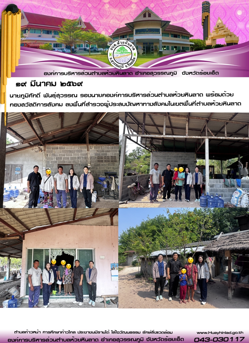 นายภูมิศักดิ์ พันธุ์สุวรรณ รองนายกองค์การบริหารส่วนตำบลห้วยหินลาด พร้อมด้วยกองสวัสดิการสังคม ลงพื้นที่สำรวจผู้ประสบปัญหาทางสังคมที่ต้องการความช่วนยเหลือในเขตพื้นที่ตำบลห้วยหินลาด